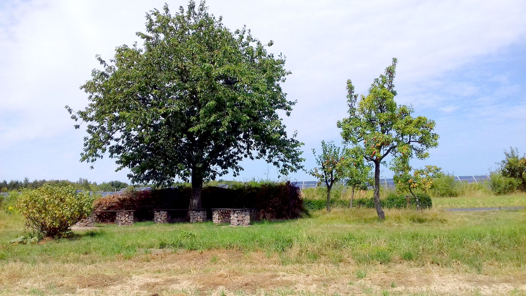 Am Apfellehrpfad stellten wir, der NABU Burgstädt, im Jahr 2018 Bänke auf. Besucher können nun von hier aus die schöne Aussicht genießen oder sie malen und dabei Pläne schmieden, wie und mit wem ein Biotopverbund für mehr Artenvielfalt und ein besseres Bodenklima zwischen den Feldern bis nach Mühlau entstehen kann. Schon jetzt erfährt man auf einer großen und zwei kleinen Schautafeln Interessantes über Obstbäume, demnächst kommen Quiz-Stationen hinzu.